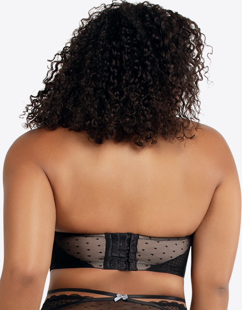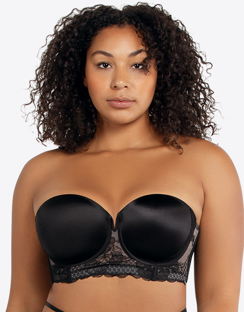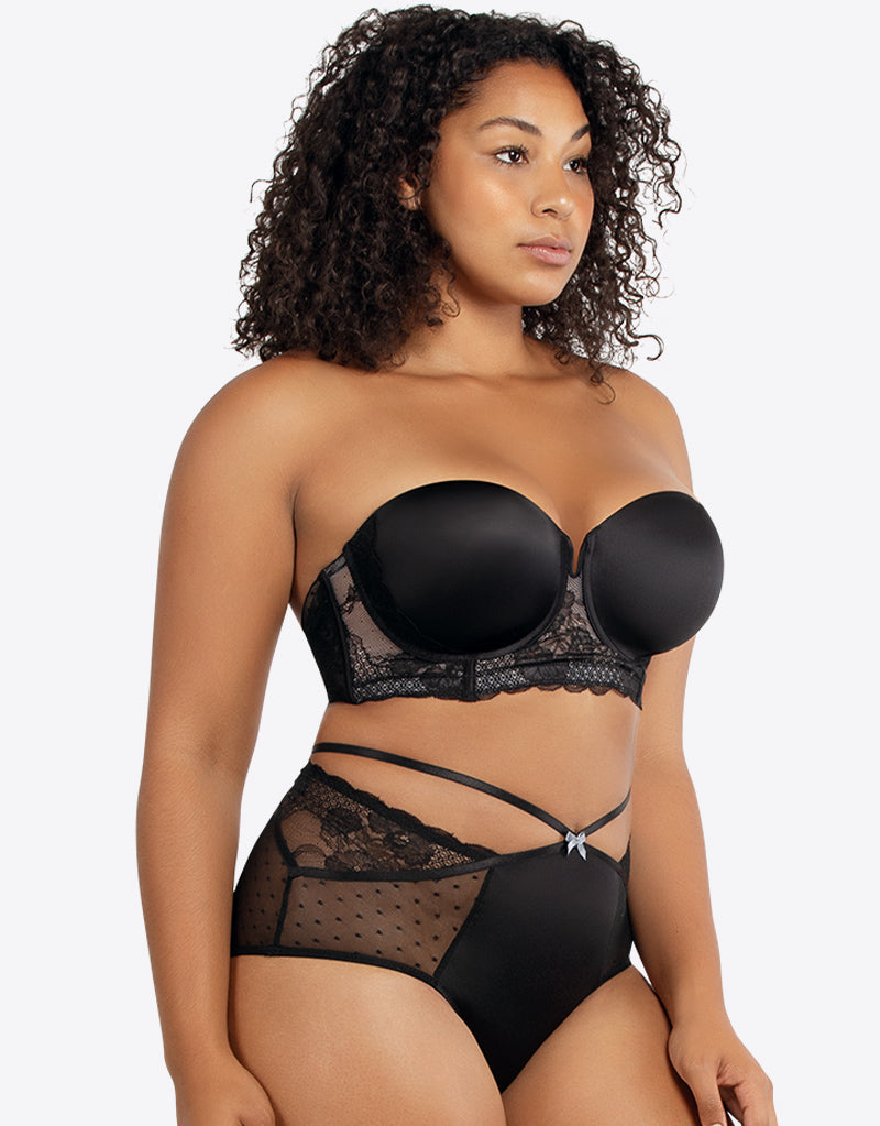 Parfait's Amber strapless bra is gorgeous in black, with seamless cups for a smooth fit under clothes and a delicate lace detail around the band. Flexible boning in the sides and under the cups of the bra help maintain a smooth shape and prevent the band from rolling, while the U-cut at the centre front adds a sexy finish to show off a little more cleavage.