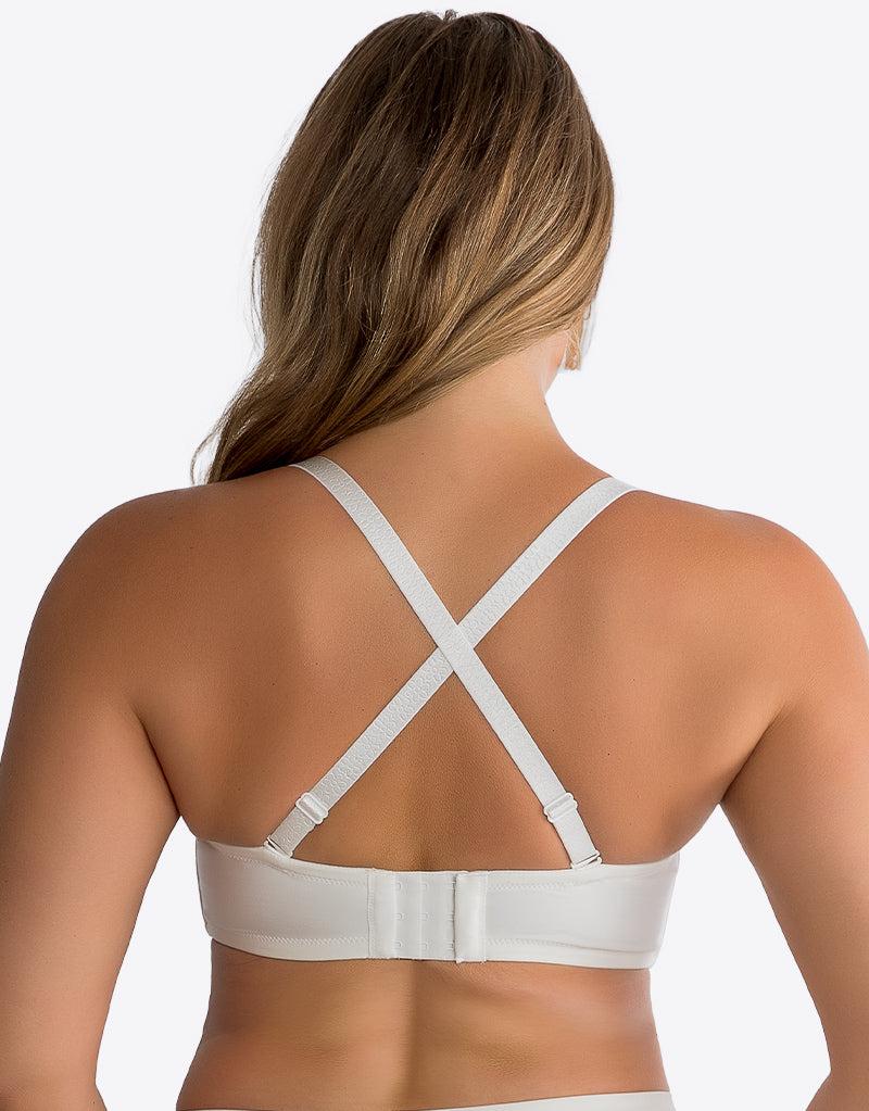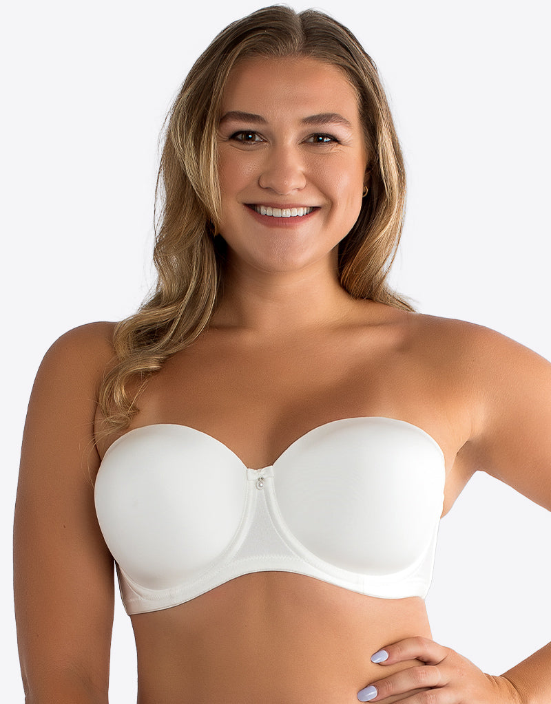 Parfait's Elise strapless bra in Pearl White is perfect for summer, and brides to be! Smooth, seamless cups ensure an invisible fit under clothes, and provide a rounded shape, while side boning in the underband prevents it from flipping and rolling uncomfortably. The neckline and back band feature a non-slip silicone grip for a fit that stays in place all day and night. Detachable straps are fully adjustable so the bra can be worn completely strapless, as a halter, with regular straps, or even as a cross-back or asymmetrical - perfect for almost every neckline!