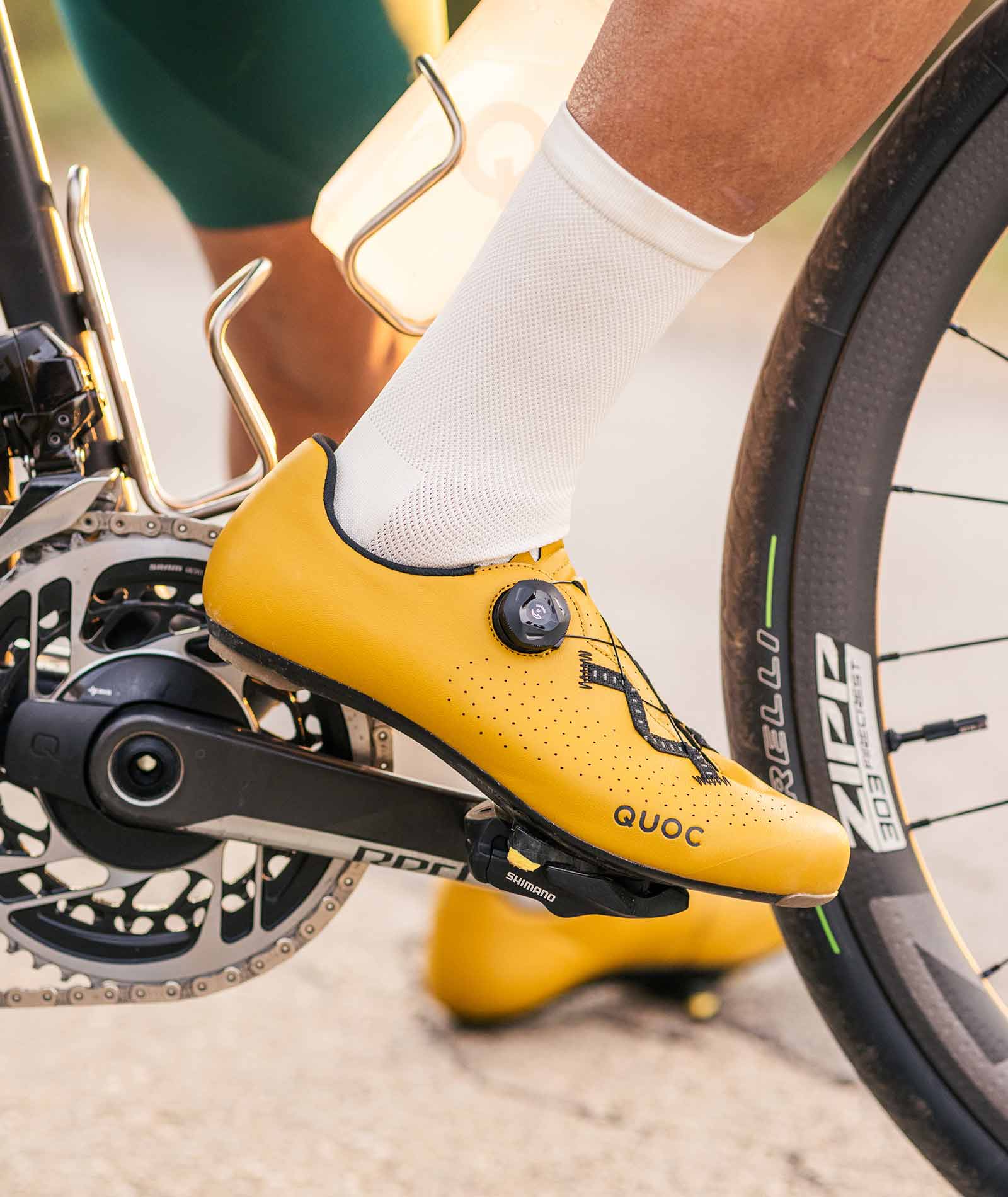 Throughout the socks, a supportive mid-arch, heel area and engineered toe-box trimmed with pink stitching meet the demands of daily wear. A tone-to-tone QUOC logo faces the rear, completing a light upper styled to reflect the dimpled Aerofoil exterior of the Mono road cycling shoe.
