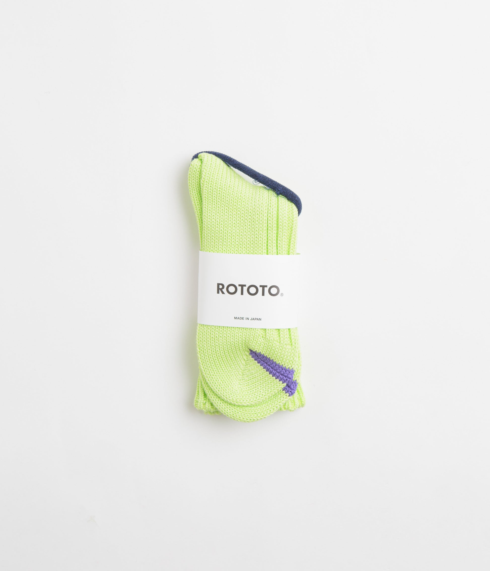 RoToTo Chunky Ribbed Crew Socks in Lime and Purple. Crafted from an organic cotton-nylon blend, these crew length RoToTo socks are designed with a thick and warm construction inspired by vintage styles. Featuring ribbed uppers and elasticated cuffs, these lime green RoToTo socks are finished with contrast purple toe box stitchings.