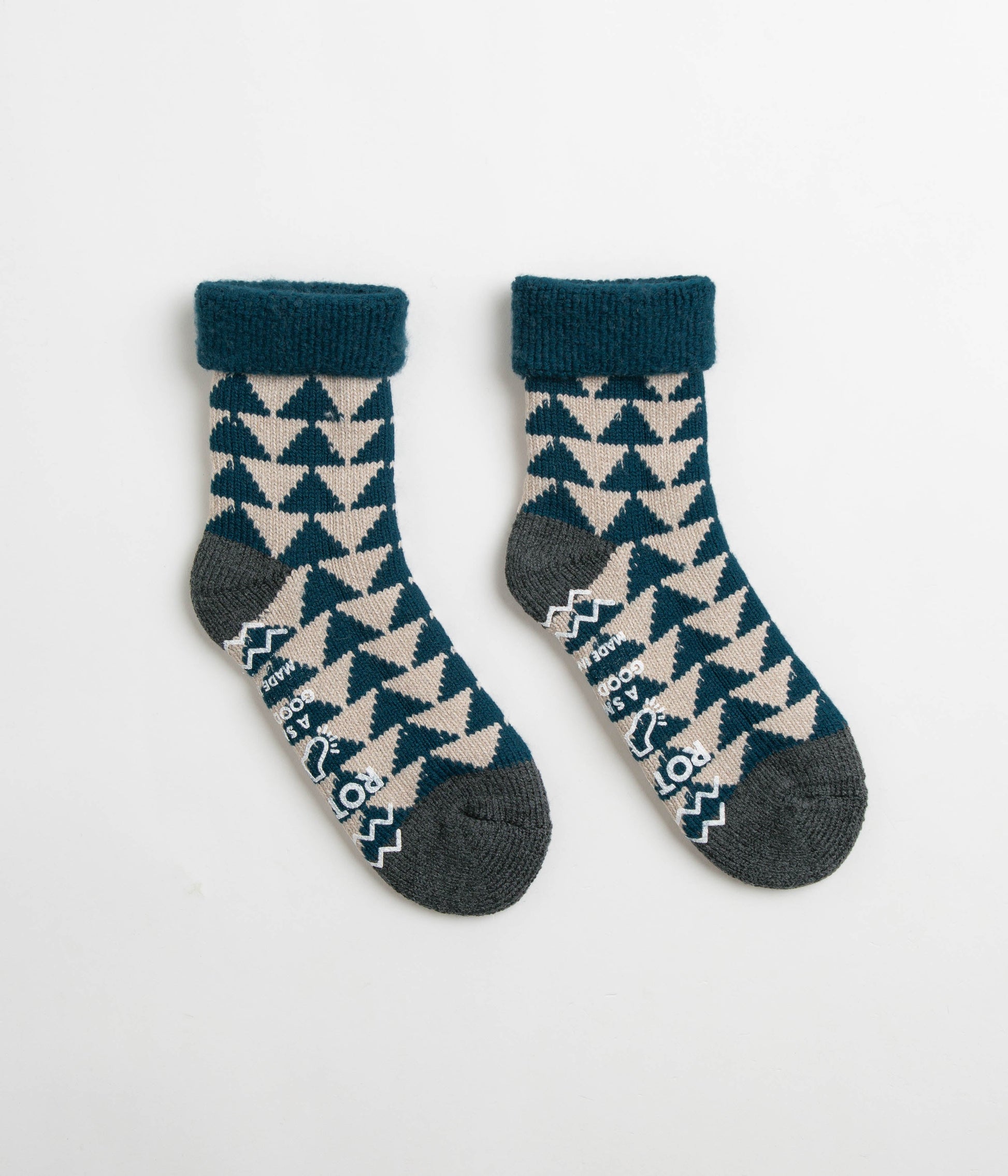 RoToTo Comfy Room Sankaku Socks in Blue Green and Charcoal. Designed with an anti-slip rubber print, these RoToTo socks are crafted from an acrylic-wool blend with a brushed lining. Featuring a turnable cuff and elasticated inner band support, these blue green RoToTo socks are finished with contrast panels and an ankle length cut.
