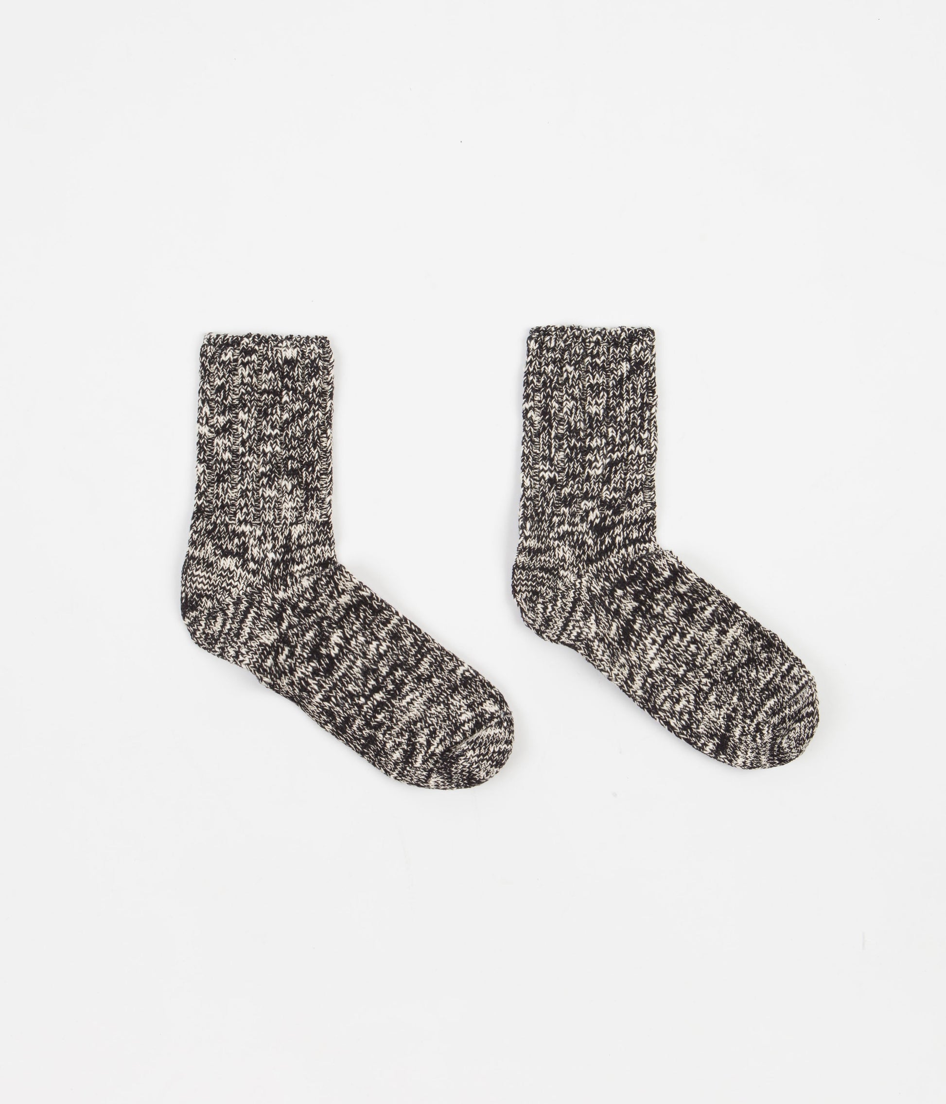 RoToTo Low Gauge Slub Socks in Black. Soft to touch and made in Japan, these premium RoToTo socks are styled with a low gauge knitted construction and cut to a classic crew length for increased insulatory comfort. Styled with reinforced stitching across the toe box and ankle, these marled monochrome socks feature elasticated rib knit cuffs to ensure additional structural support regardless of applied setting.
