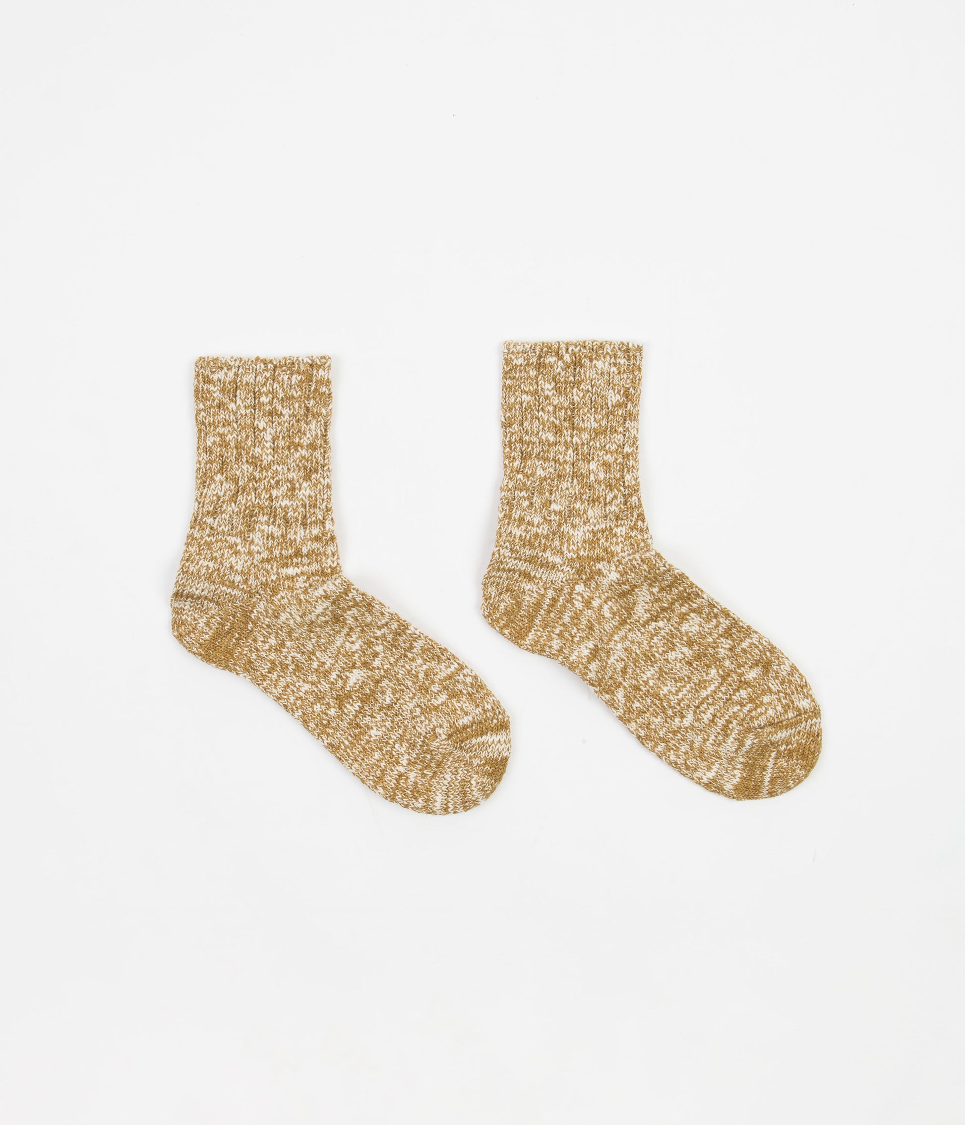 RoToTo Low Gauge Slub Socks in Mustard. Arriving as part of the brand’s latest AW21 collection and made in Japan, these highly insulative RoToTo socks feature a low gauge knitted construction and are cut to a classic crew length for elevated everyday comfort. Soft to touch with a refreshing marled colourway, these everyday socks are signed off with reinforced tonal stitchings across both the toe box and ankle, whilst the elasticated rib knit collars provide additional structural support to suit.