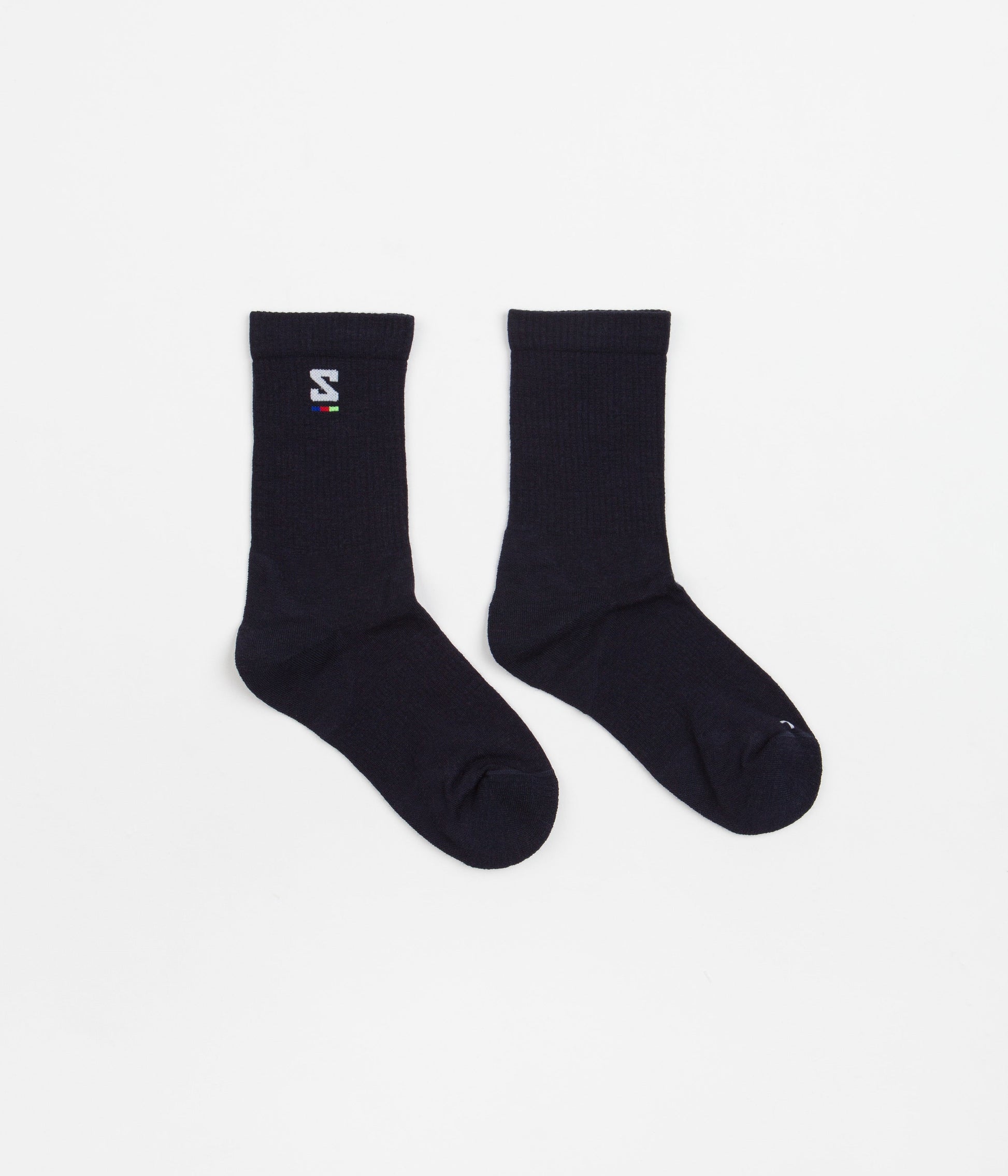 Salomon Sunday Smart Crew Socks in Dark Sapphire and White. Part of the brand’s Sportstyle collection and cut to crew length, these Salomon socks are crafted from a recycled Merino wool blend. Featuring ribbed cuffs, elasticated arch supports and a temperature regulating construction, these dark blue sapphire Salomon socks are finished with protective toe box details and with woven branding sewn across each ankle.